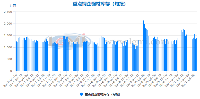 据中国钢铁工业协会统计数据显示,2021年7月上旬重点钢铁企业钢材库存量为1405.73万吨,旬环比增加29.12万吨,上升2.12%;比年初增加243.63万吨,上升20.96%;比去年同期增加44.14万吨,上升3.24%。