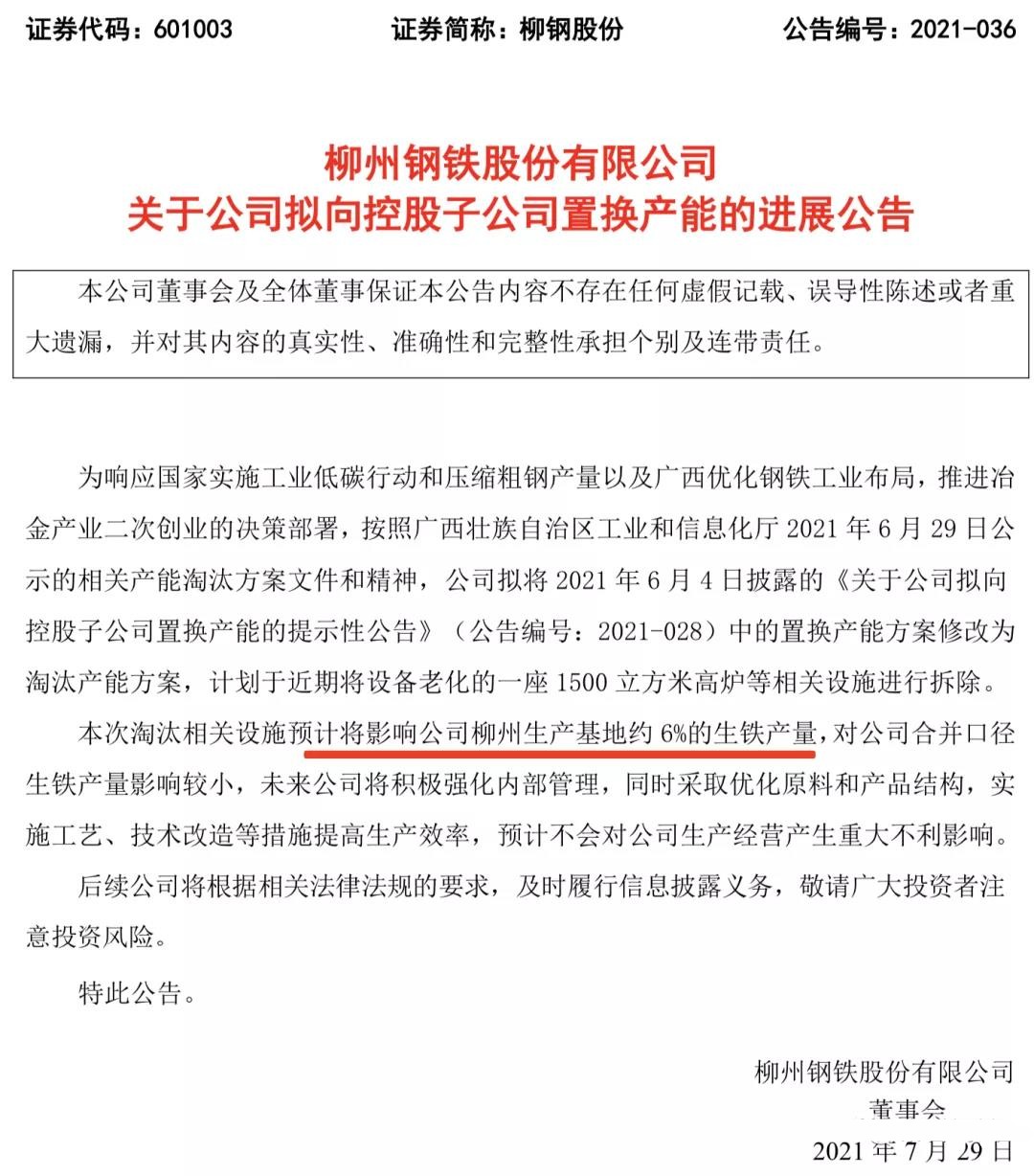 公告显示,本次淘汰相关设施预计将影响公司柳州生产基地约6%的生铁产量,对公司合并口径生铁产量影响较小。
