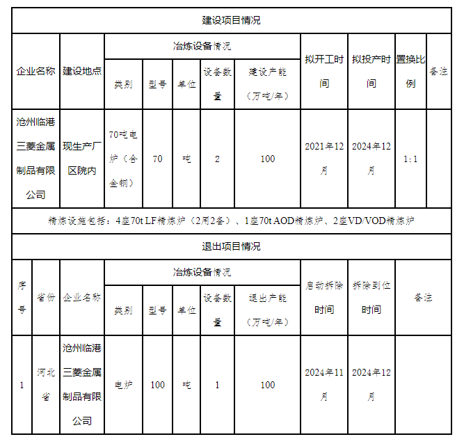 沧州临港三菱金属制品有限公司技术改造项目产能置换方案公告