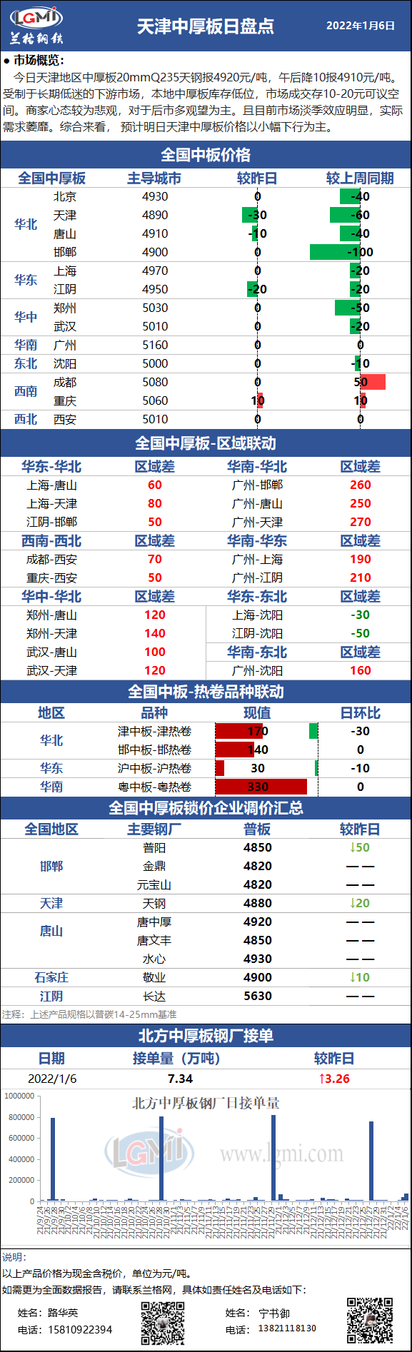 - 1月6日天津中厚板库存低位 后市观望为主2022/1/6