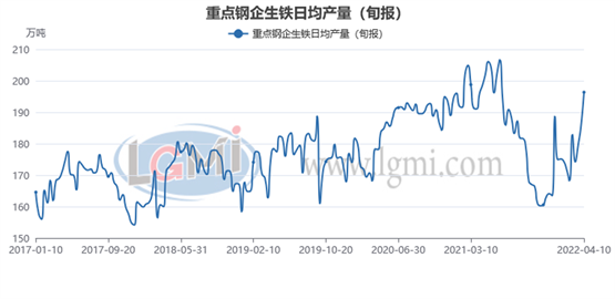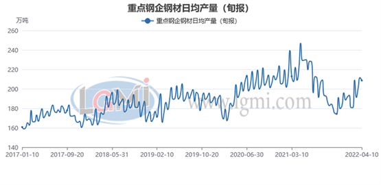 据中国钢铁工业协会统计数据显示,2022年4月上旬重点钢企生铁日均产量196.37万吨,旬环比上升5.65%,同比上升0.18%;4月上旬重点钢企粗钢日均产量222.40万吨,旬环比上升2.96%,同比下降2.20%;4月上旬重点钢企钢材日均产量208.82万吨,旬环比下降1.34%,同比下降0.12%。