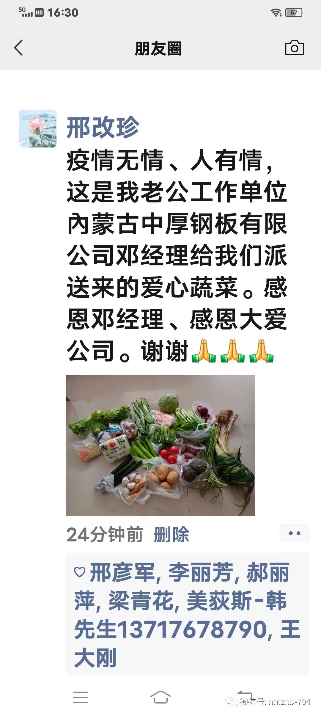 14mm厂张文轩:团结一致共克时艰的疫情防控之时,我的单位~内蒙古中厚钢板有限公司为全体员工购买蔬菜,挨家挨户送菜上门,避免去人多地方聚集,工作生活两点一线。有幸生逢好单位,无愧成为中厚人,满腔热忱爱包头,立足岗位作贡献!