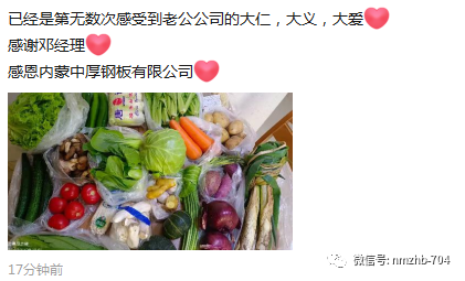 爱心“蔬菜包”,浓浓企业情。11月9日内蒙古中厚钢板有限公司开始闭环管理一周,公司84名员工一半人驻厂保产,在众志成城共同抗击疫情的艰难时期,公司想员工所想,急员工所急,解员工所需,积极联系蔬菜供应商进行物资配送,将新鲜蔬菜包免费配送到每一位员工家中,践行“为员工的高收入、被尊重和快乐工作而努力奋斗的目标”,持续坚持25年不改变,不忘员工就是中厚的初心。收到爱心蔬菜包的员工纷纷发来感谢信表达心中的感激之情。驻厂员工的家属也晒到朋友圈表达感激之情。患难见真情,感谢公司心系员工,送来暖心蔬菜。为了让驻厂员工吃的更好,邓经理夫人特意买了三件鸡腿火速派送到单位,给驻厂员工改善伙食。B组居家员工将配合社区做好个人防护,坚持居家办公,驻厂员工做好自我防护,推进公司各项业务有序进行,竭诚为广大客户提供高质量服务,秉承物美价廉服务好,贯彻QCDDS管理理念,满腔热忱爱包头,立足岗位作贡献。