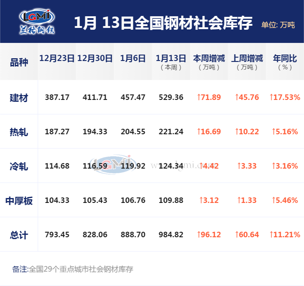- 国内重点城市钢材库存汇总(01.13)2023/1/13