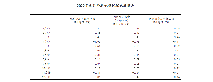 (2)根据季节调整模型自动修正结果,对近一年来各期国内生产总值、规模以上工业增加值、固定资产投资(不含农户)、社会消费品零售总额环比增速进行修订。修订结果及2022年四季度GDP环比数据、2022年12月份其他指标环比数据如下: