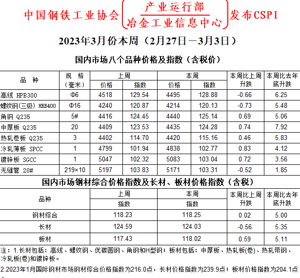 - 2023年3月份本周(2月27日-3月3日)国内市场八个品种价格及指数(含税价)2023/3/6