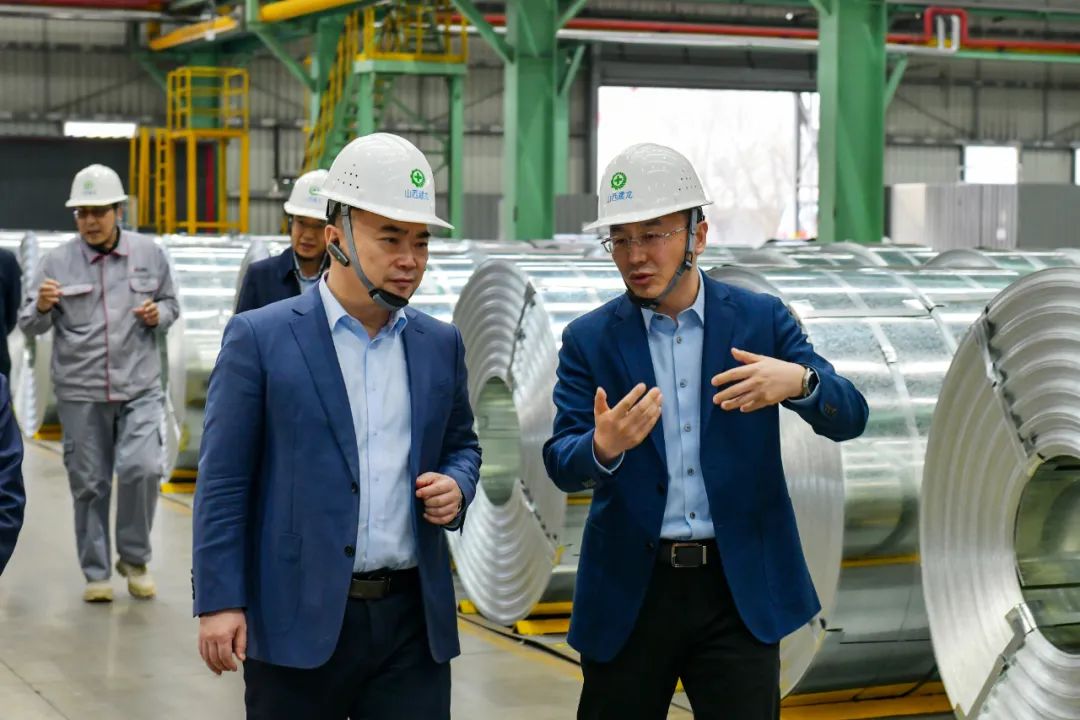 在湖鑫岛,李大亮详细介绍了企业转型升级、科技创新、生产经营、市场开拓等情况。他表示,山西建龙坚持“做大经营中心、做优技术中心、做强制造中心”,加快向“经营型、创新型、数智型、美好企业”转型,全力打造生产制造服务为一体的中西部国家级优特钢产业集群。在850mm冷轧带钢生产线,他介绍了850冷轧带钢项目的项目建设、生产工艺、终端产品应用及市场拓展等情况。