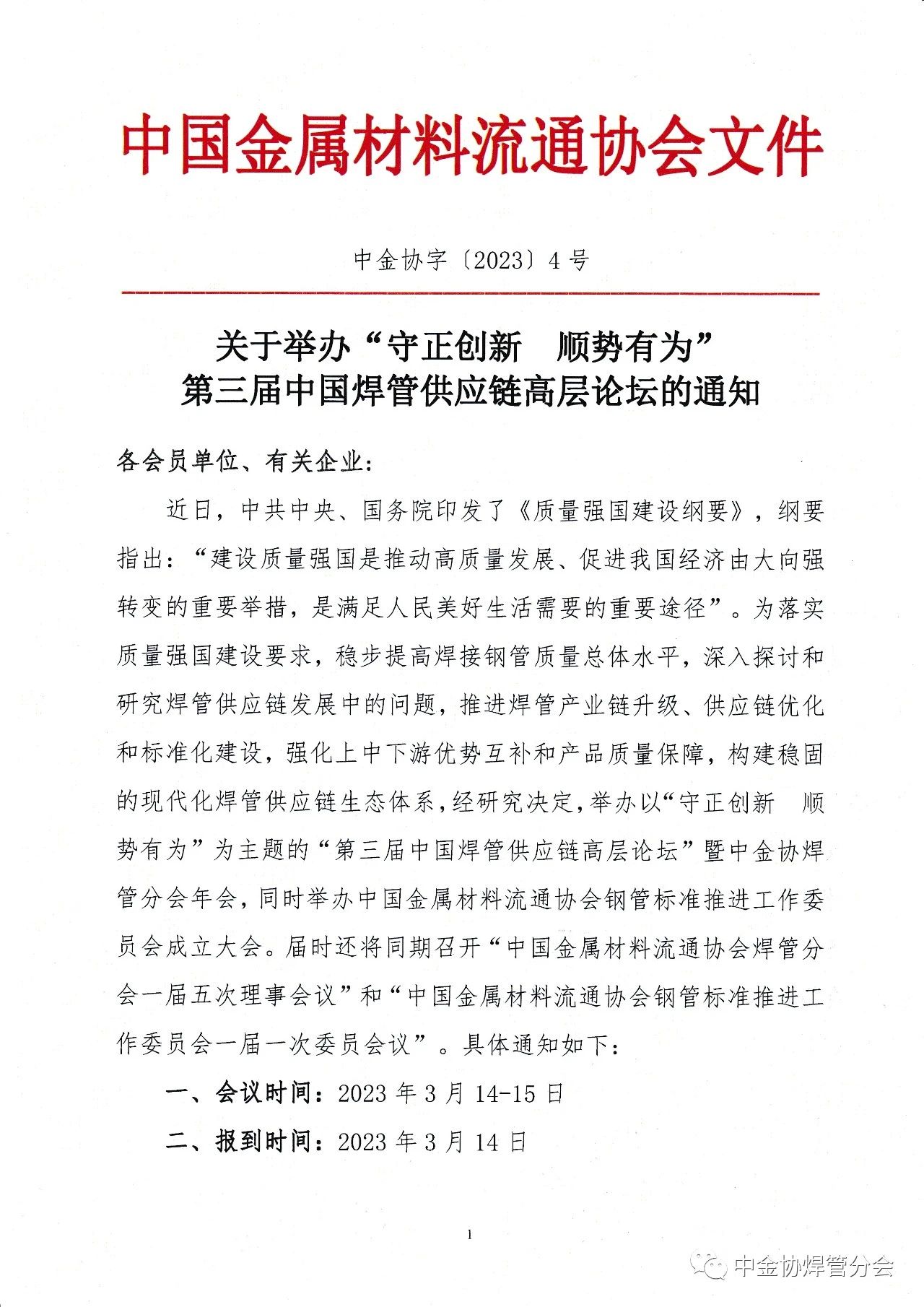 关于举办“守正创新 顺势有为”第三届中国焊管供应链高层论坛的通知