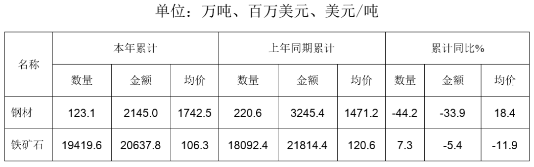 2023年1-2月,我国累计进口铁矿石19419.6万吨,同比增加1327.2万吨,增幅7.3%;均价106.3美元/吨,同比下跌14.3美元/吨,跌幅11.9%。