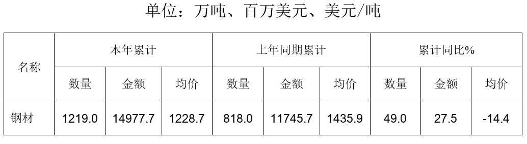 2023年1-2月,我国累计出口钢材1219.0万吨,同比增加401万吨,增幅49.0%;均价1228.7美元/吨,同比下跌207.2美元/吨,跌幅14.4%。