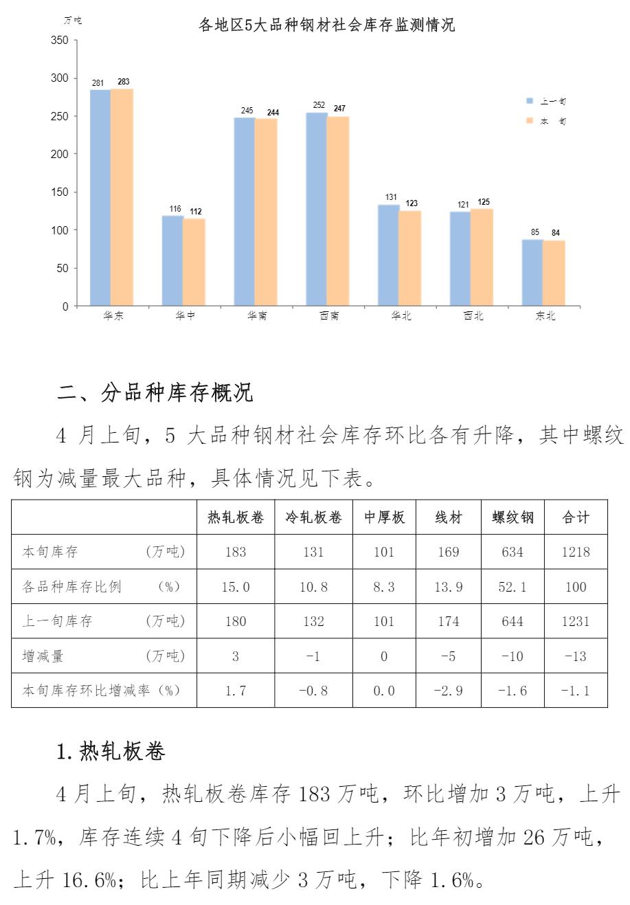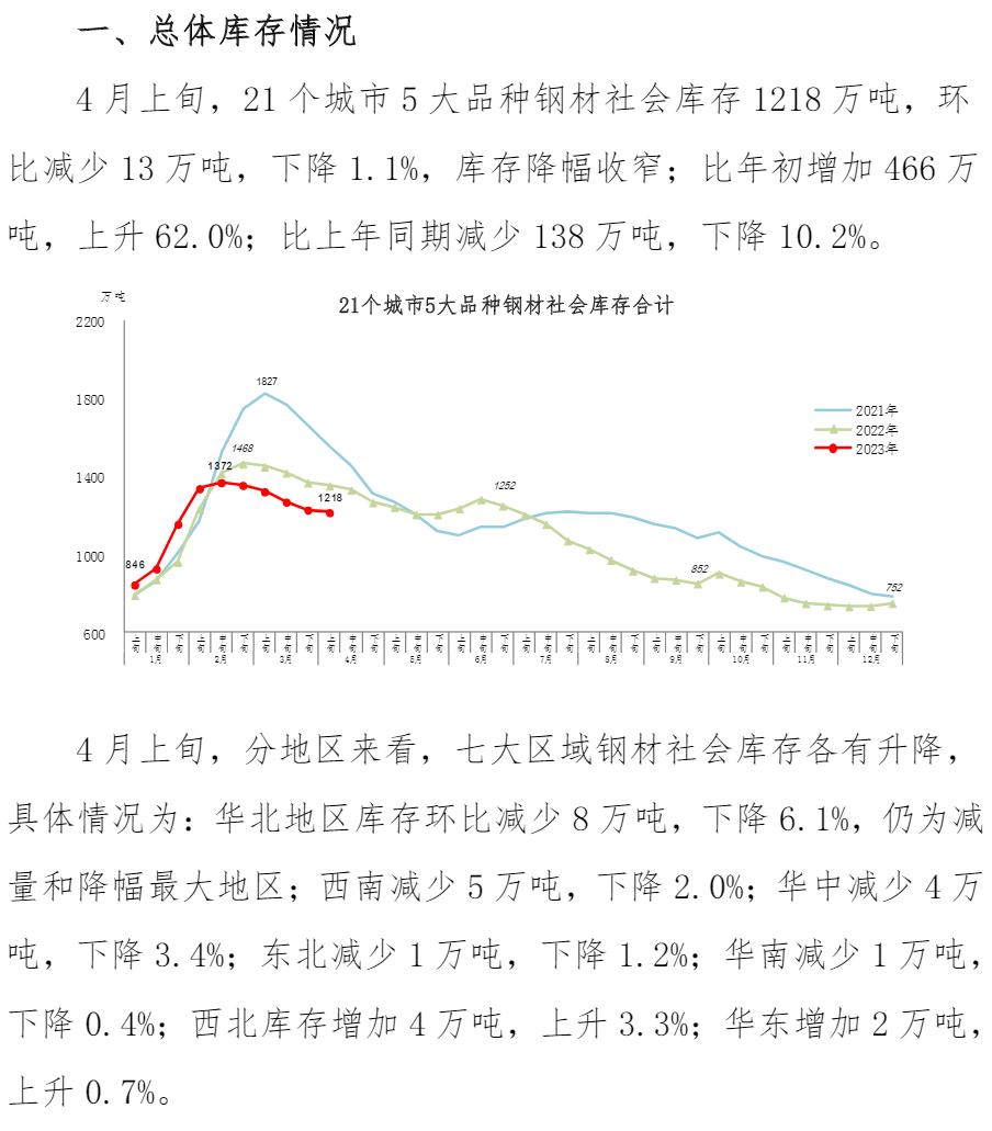 - 4月上旬钢材社会库存1218万吨 环比下降1.1%2023/4/14