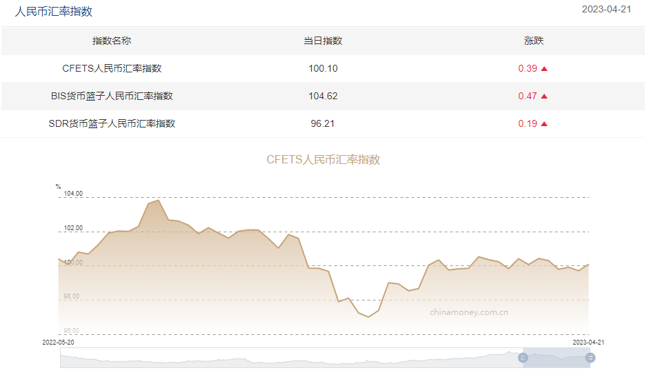 中国外汇交易中心最新计算的2023年4月21日CFETS人民币汇率指数为100.01,按周涨0.39%;BIS货币篮子人民币汇率指数报104.62,按周涨0.47%;SDR货币篮子人民币汇率指数报96.21,按周涨0.19%。