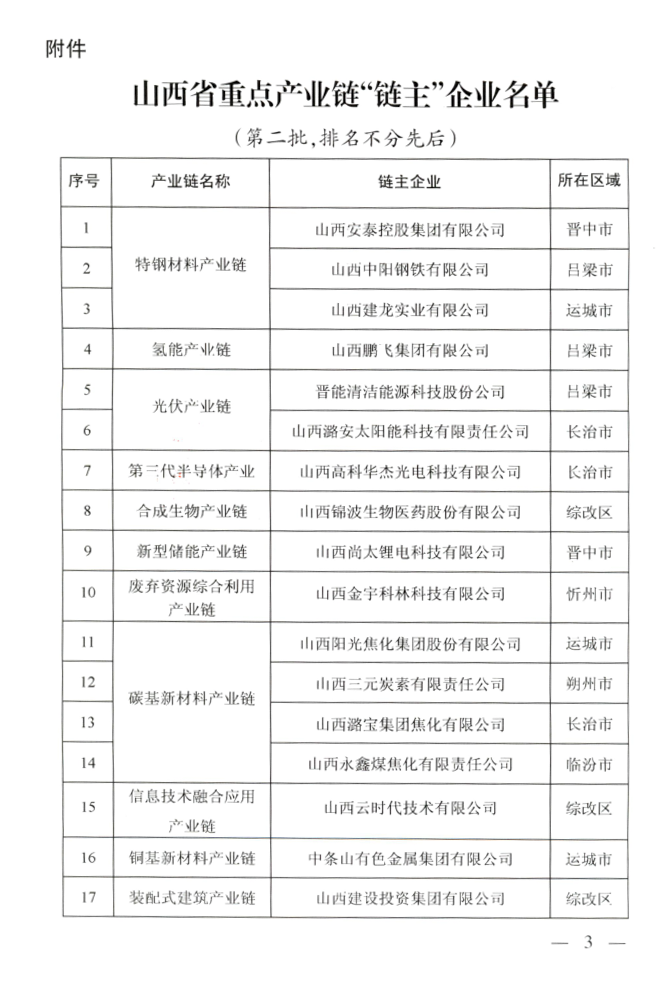 11月1日,山西省重点产业链“链主”企业名单(第二批)公布,涉及特钢材料等11条产业链,共17家企业。山西建龙实业有限公司作为特钢材料产业链“链主”企业位列其中。