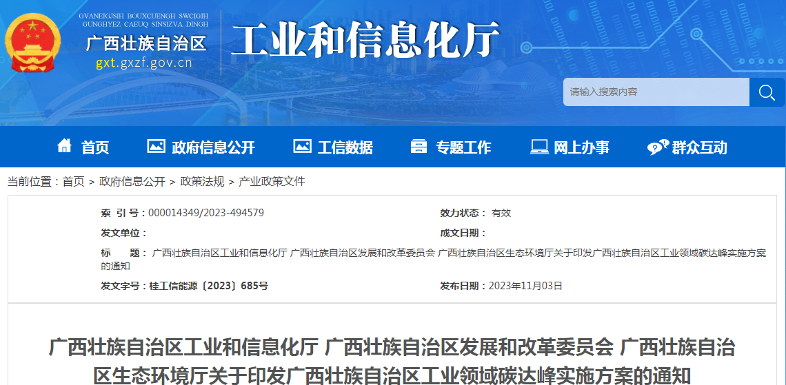 - 广西三部门印发广西壮族自治区工业领域碳达峰实施方案2023/11/17