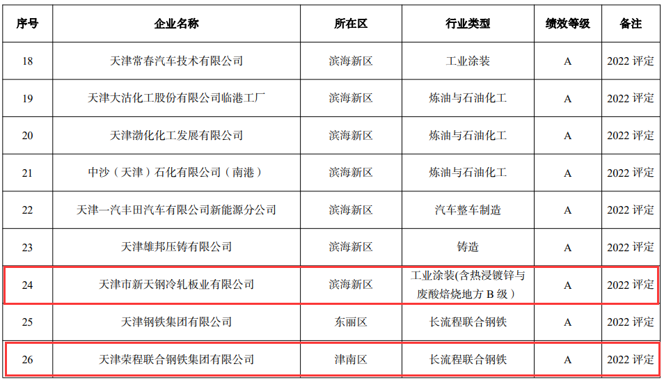 天津3家钢企入选2023年天津市重污染天气绩效A级企业名单
