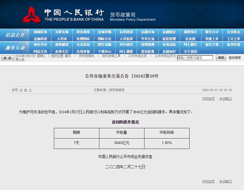 - 人民银行开展3840亿元逆回购操作 中标利率1.8%2024/2/27