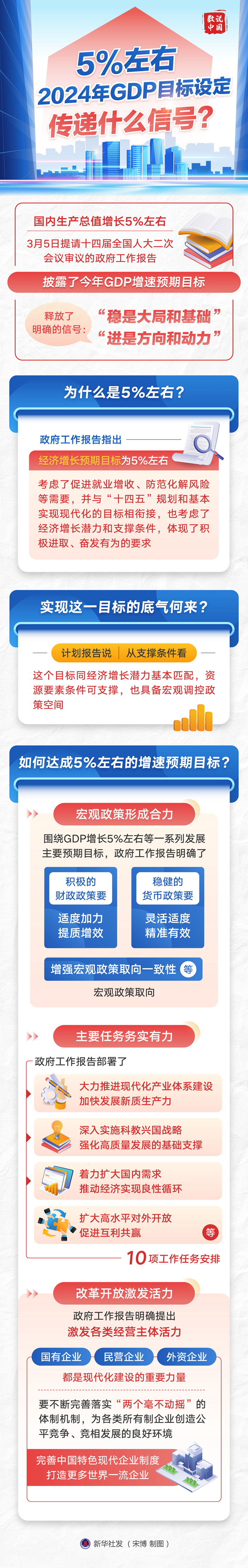 政府工作报告指出,经济增长预期目标为5%左右,考虑了促进就业增收、防范化解风险等需要,并与“十四五”规划和基本实现现代化的目标相衔接,也考虑了经济增长潜力和支撑条件,体现了积极进取、奋发有为的要求。