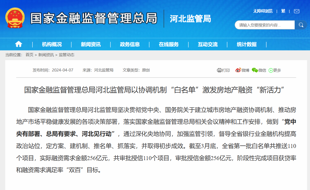 4月7日,国家金融监督管理总局河北监管局网站刊发文章《国家金融监督管理总局河北监管局以协调机制“白名单”激发房地产融资“新活力”》。其中披露数据显示,截至3月底,河北省第一批白名单共推送110个项目,实际融资需求金额256亿元,共审批授信110个项目,审批授信金额256亿元,阶段性完成项目获贷率和融资需求满足率“双百”目标。