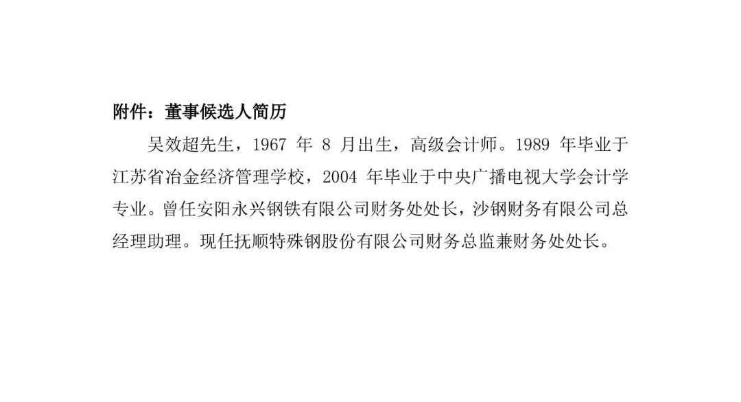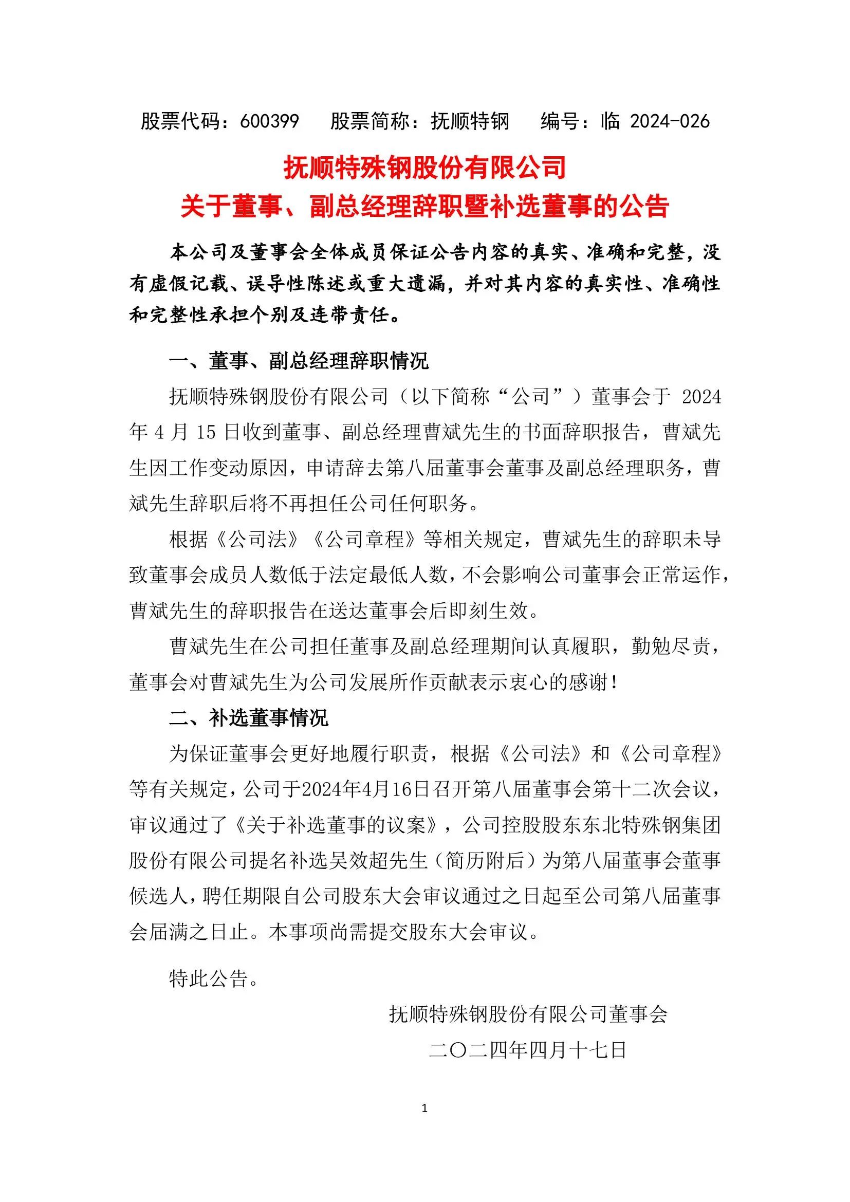 抚顺特殊钢股份有限公司关于董事、副总经理辞职暨补选董事的公告显示:抚顺特殊钢股份有限公司董事会于2024年4月15日收到董事、副总经理曹斌先生的书面辞职报告,曹斌先生因工作变动原因,申请辞去第八届董事会董事及副总经理职务,曹斌先生辞职后将不再担任公司任何职务。补选董事情况及具体公告如下——
