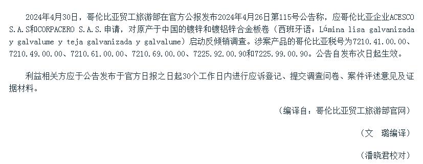哥伦比亚对华镀锌和镀铝锌板卷启动反倾销调查