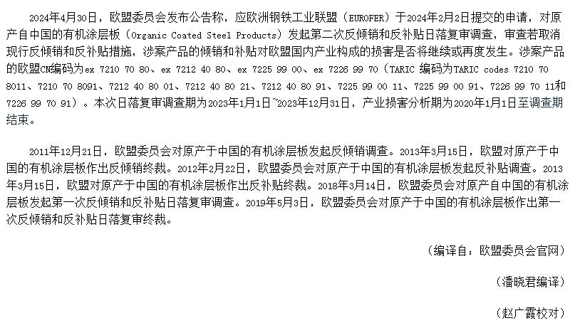 - 欧盟对华有机涂层板发起第二次双反日落复审调查2024/5/8