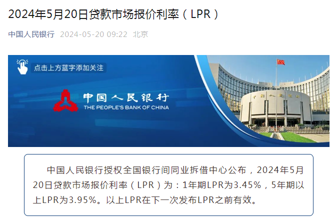 5月LPR报价维持不变:1年期LPR为3.45%,5年期以上LPR为3.95%