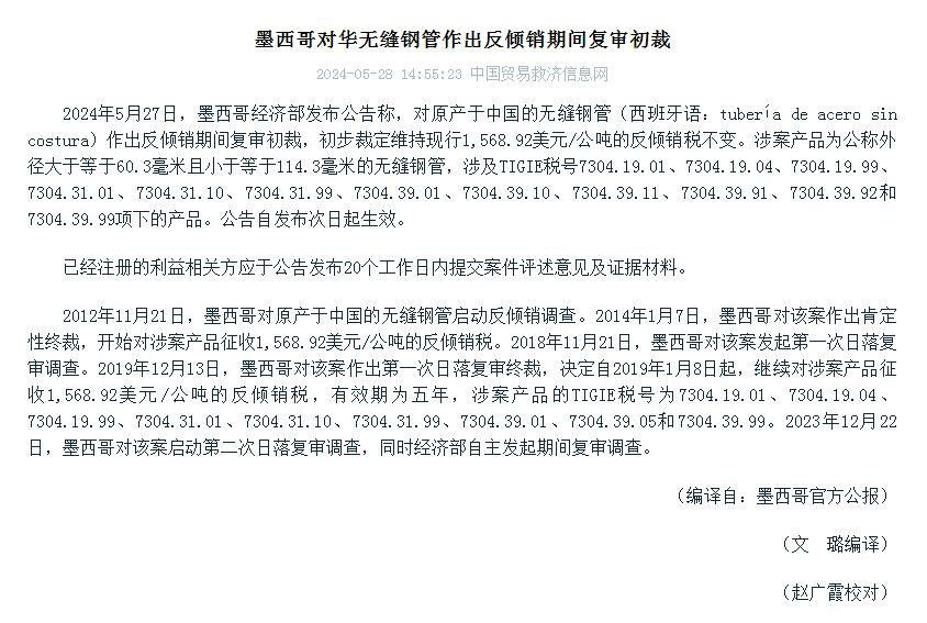 - 墨西哥对华无缝钢管作出反倾销期间复审初裁2024/5/28