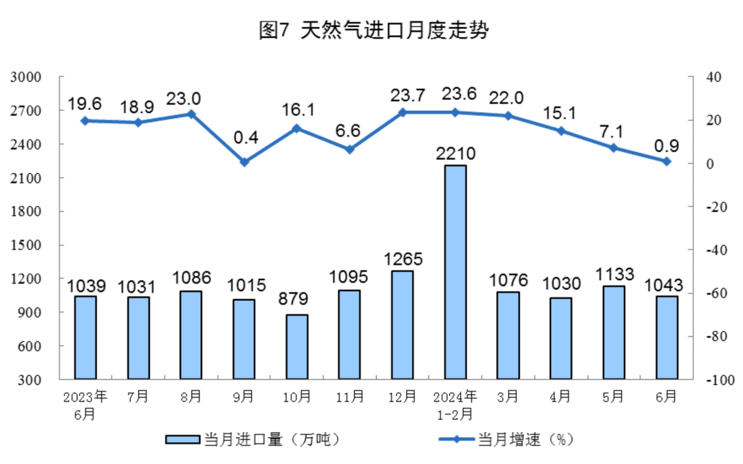 6月份,规上工业天然气产量202亿立方米,同比增长9.6%,增速比5月份加快3.3个百分点;日均产量6.7亿立方米。进口天然气1043万吨,同比增长0.9%。