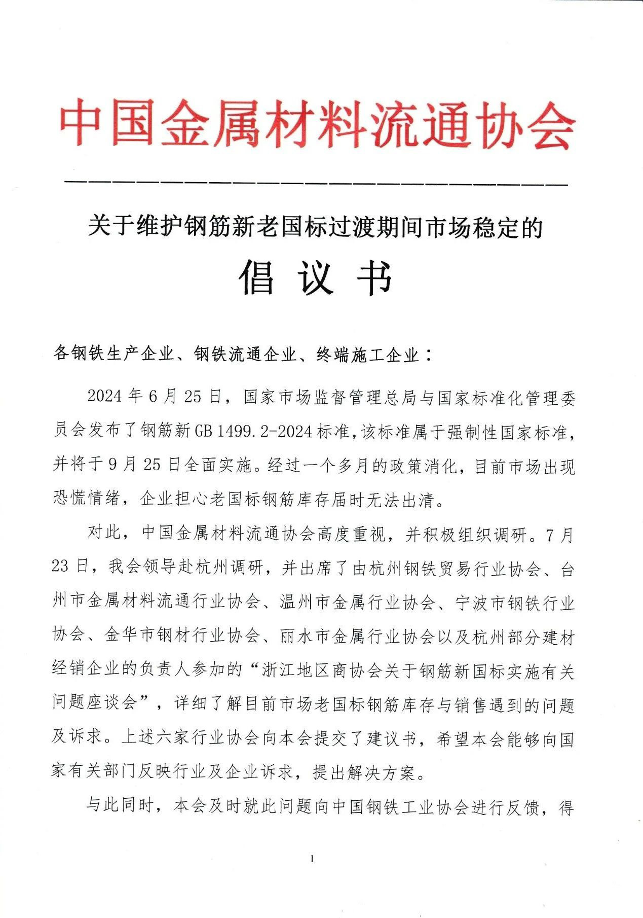 中金协发布维护钢筋新老国标过渡期间市场稳定的倡议书