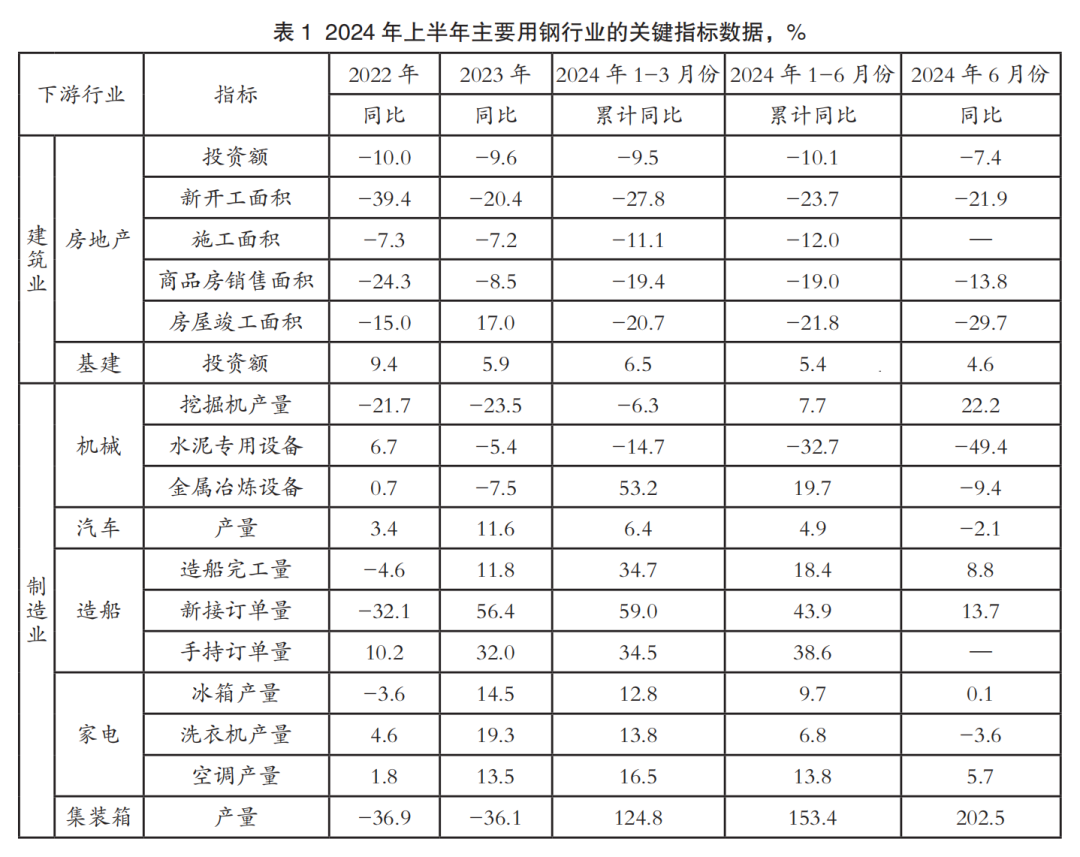 2024年上半年,主要用钢行业运行呈分化态势,建筑业继续下行,制造业平稳增长。其中,房地产主要指标同比继续下降;基础设施建设投资和电力投资保持稳定增长,增幅有所收窄;机械行业工业增加值保持正增长,机电产品出口额增幅有所扩大;船舶和集装箱行业实现大幅增长;汽车产量保持平稳增长,其中新能源汽车产量和汽车出口量继续大幅增长;家电行业三大白电产品产量均保持增长,增幅有所收窄。
