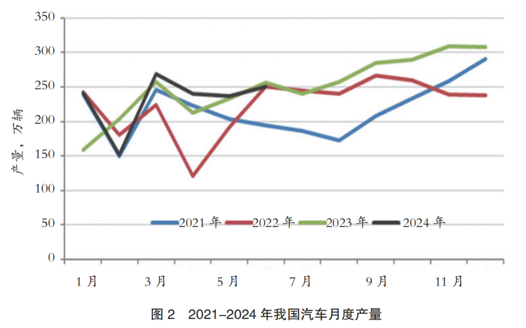 上半年,我国生产汽车1389万辆,同比增长4.9%,增幅有所收窄。(图2)其中,乘用车产量1189万辆,同比增长5.4%;商用车产量201万辆,同比增长2.0%。新能源汽车产量保持较快增长,同比增长30.1%,销量占比进一步扩大至35.2%。出口汽车279万辆,同比增长30.5%,增幅略有收窄。