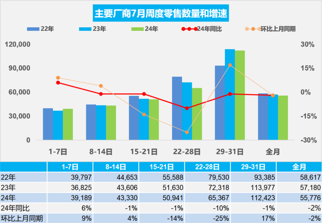 7月第三周乘用车市场日均零售5.1万辆,同比去年7月同期下降1%,较上月同期降14%。