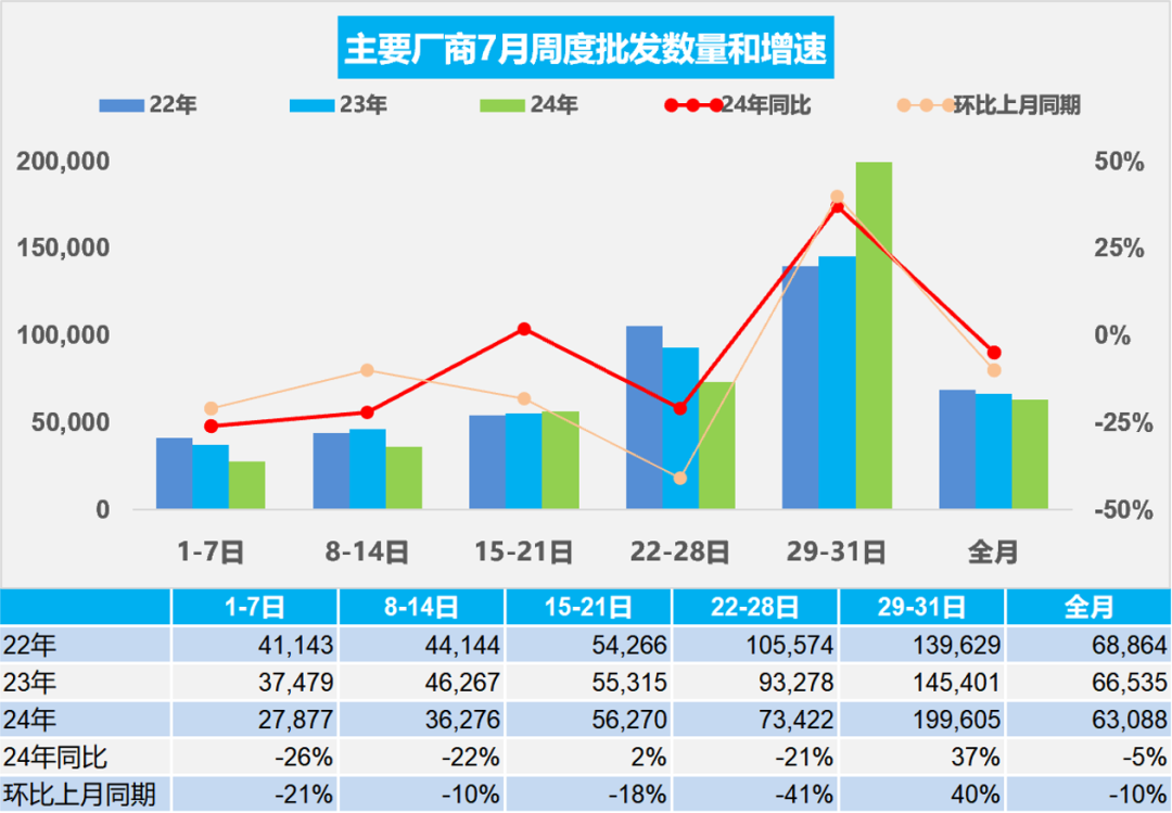 7月第五周批发日均20.0万辆,同比去年7月同期增长37%,环比上月同期增长40%。