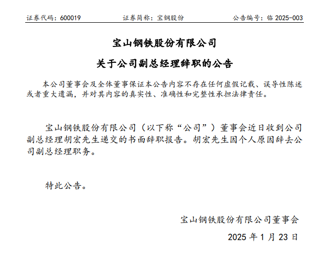 - 重大人事变动!宝钢股份副总经理胡宏辞职2025/1/24