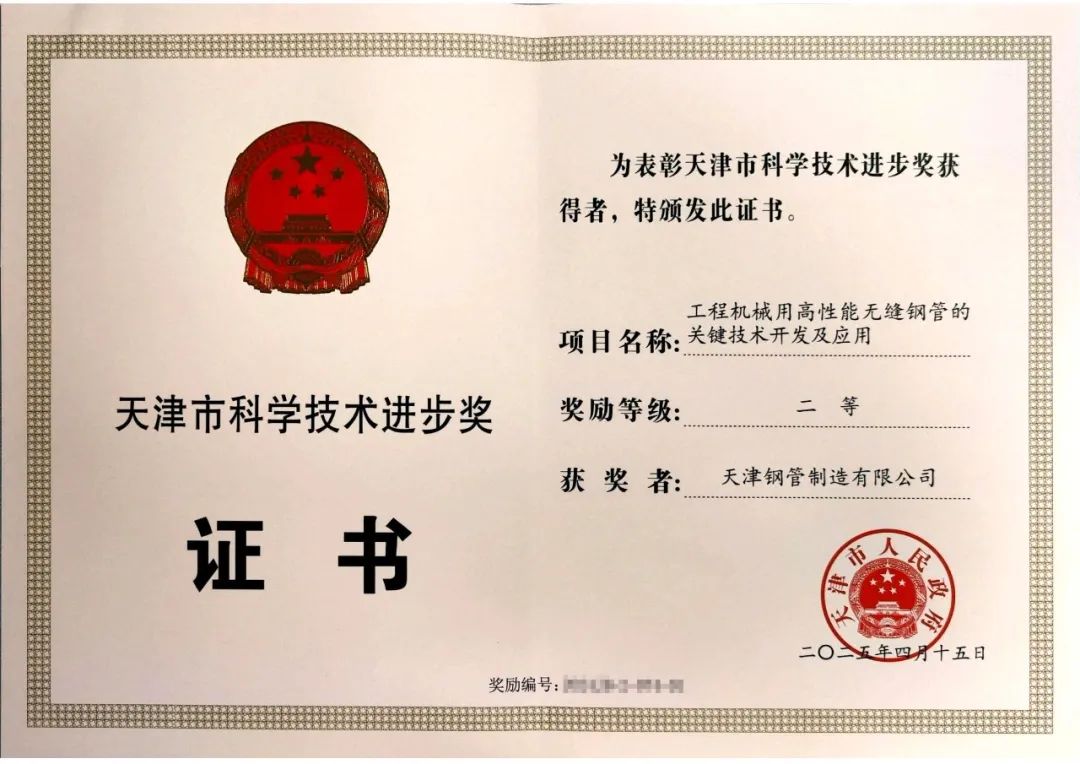 日前,天津市科学技术奖励大会召开,会议宣读了《天津市人民政府关于颁布2024年度天津市科学技术奖励的决定》,天津钢管申报的《工程机械用高性能无缝钢管的关键技术开发及应用》项目荣获2024年度天津市科技进步奖二等奖,彰显了公司在专业管材领域研发的实力。