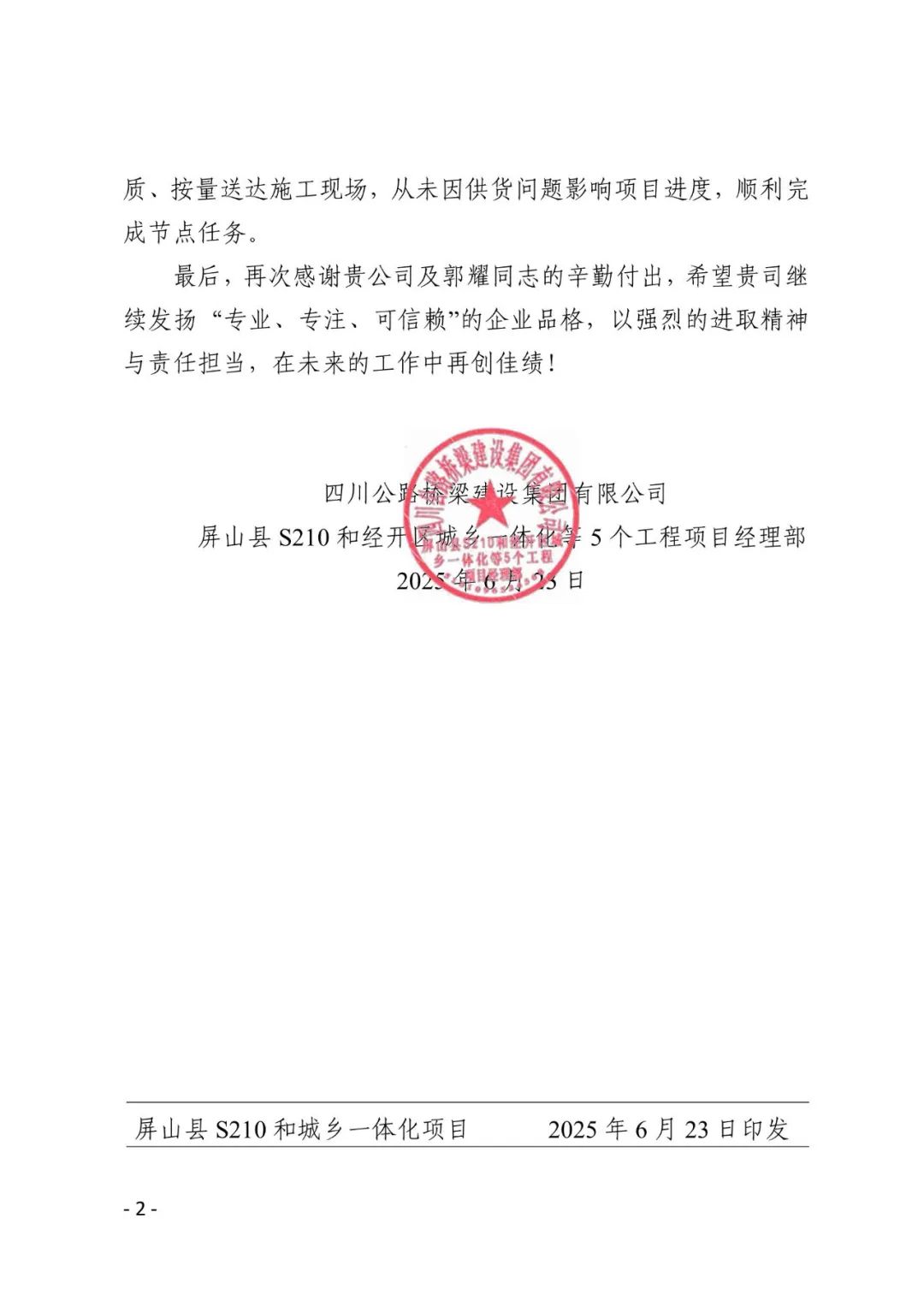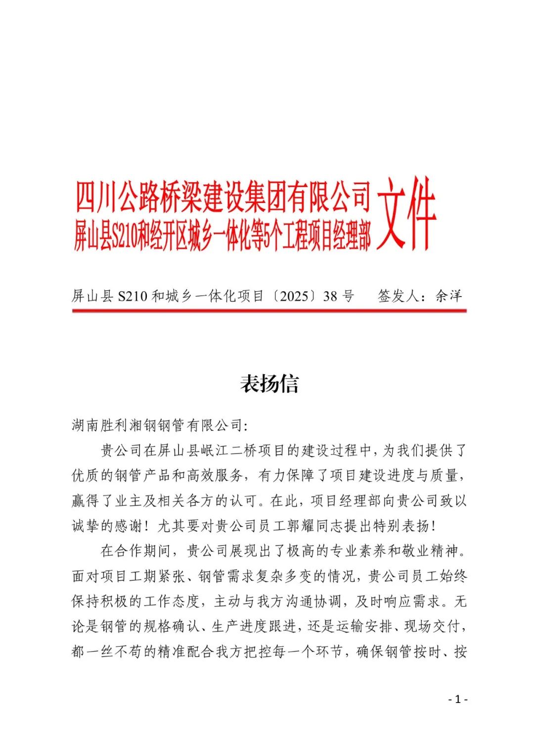 近期,胜利湘钢钢管收到四川路桥集团有限公司发来的感谢信并特别指出,胜利湘钢钢管供货的钢管质量可靠、交付及时,为岷江二桥项目的顺利推进提供了坚实保障。
