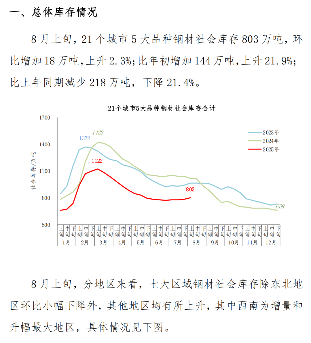 - 中钢协:8月上旬钢材社会库存803万吨,环比上升2.3%2025/8/15