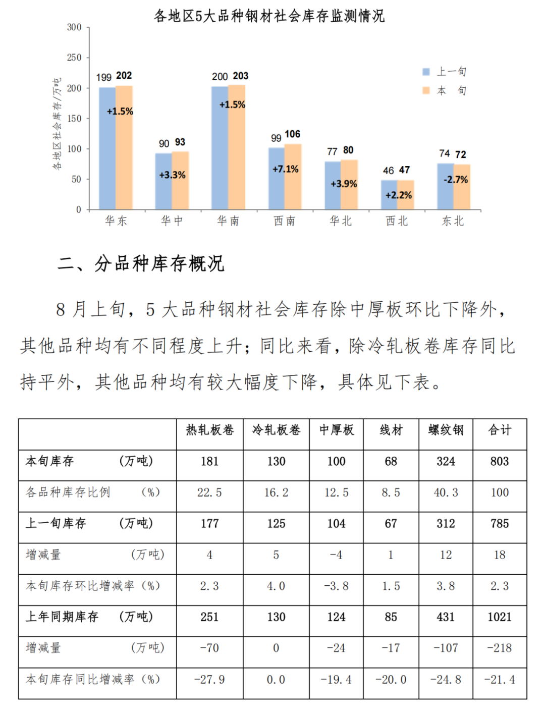 中钢协:8月上旬钢材社会库存803万吨,环比上升2.3%