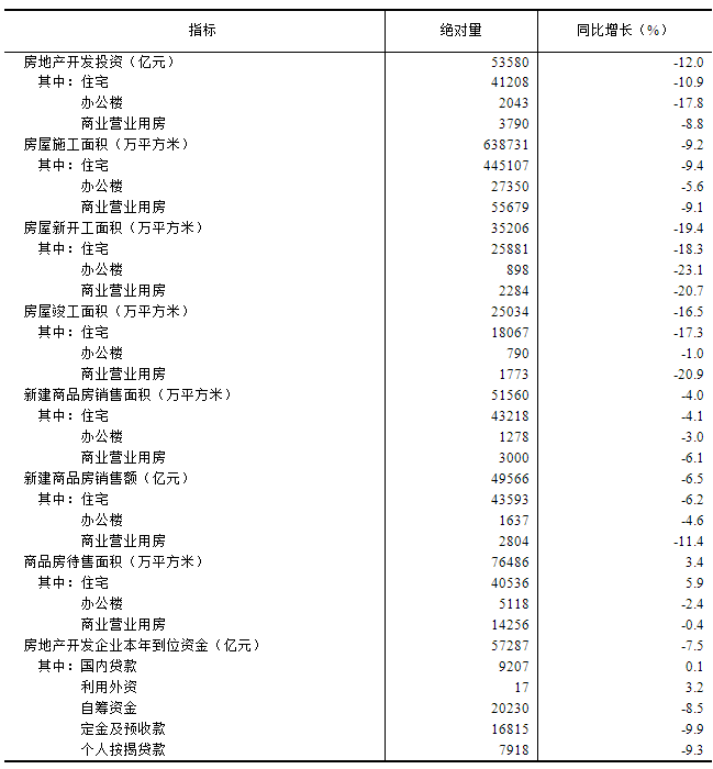 1—7月份,房地产开发企业房屋施工面积638731万平方米,同比下降9.2%。其中,住宅施工面积445107万平方米,下降9.4%。房屋新开工面积35206万平方米,下降19.4%。其中,住宅新开工面积25881万平方米,下降18.3%。房屋竣工面积25034万平方米,下降16.5%。其中,住宅竣工面积18067万平方米,下降17.3%。
