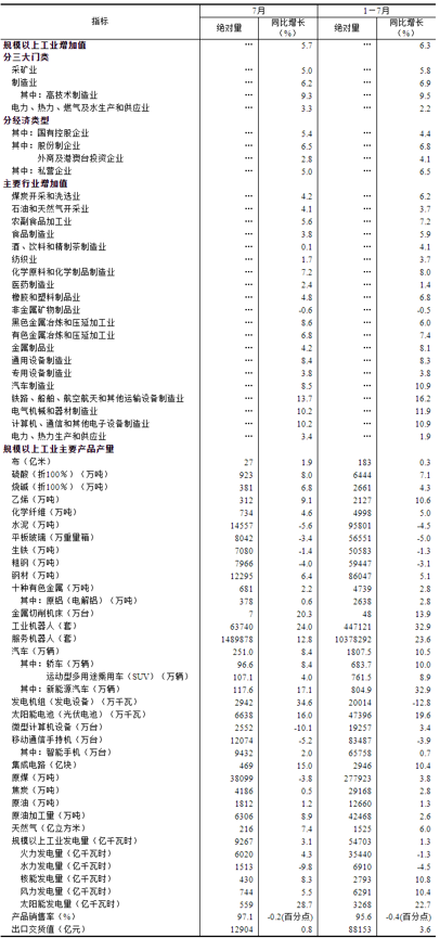 分行业看,7月份,41个大类行业中有35个行业增加值保持同比增长。其中,煤炭开采和洗选业增长4.2%,石油和天然气开采业增长4.1%,农副食品加工业增长5.6%,酒、饮料和精制茶制造业增长0.1%,纺织业增长1.7%,化学原料和化学制品制造业增长7.2%,非金属矿物制品业下降0.6%,黑色金属冶炼和压延加工业增长8.6%,有色金属冶炼和压延加工业增长6.8%,通用设备制造业增长8.4%,专用设备制造业增长3.8%,汽车制造业增长8.5%,铁路、船舶、航空航天和其他运输设备制造业增长13.7%,电气机械和器材制造业增长10.2%,计算机、通信和其他电子设备制造业增长10.2%,电力、热力生产和供应业增长3.4%。
