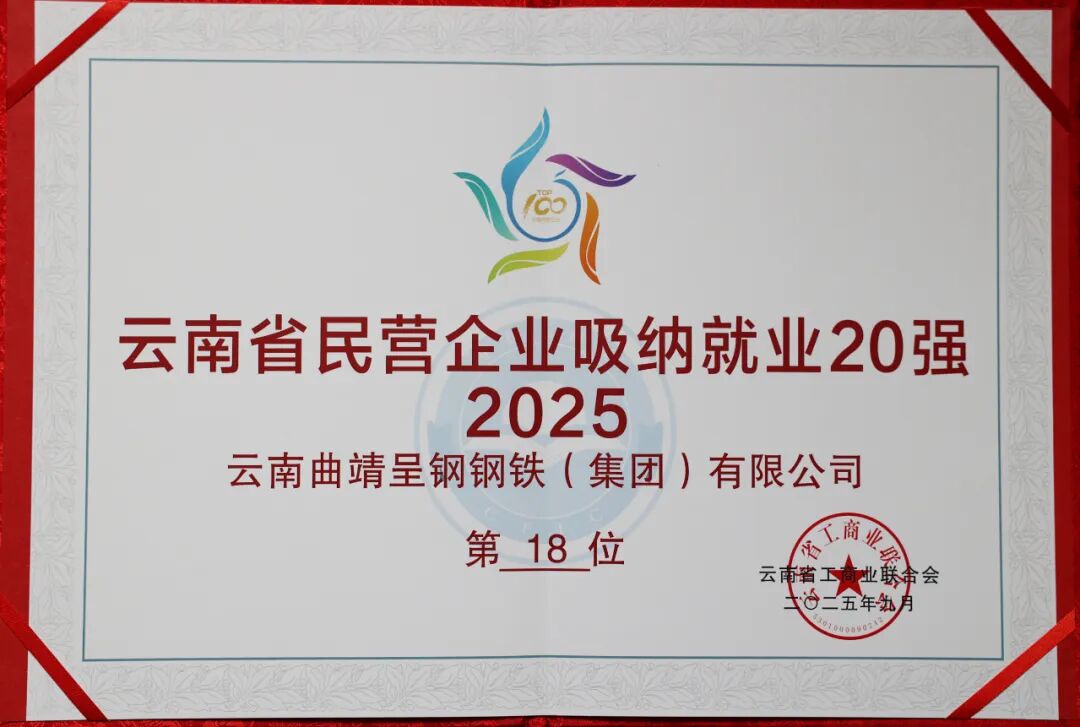 9月19日,2025云南省民营企业100强发布会在昆明举行。会上发布了“2025云南省民营企业100强”“制造业20强”“服务业20强”“创新能力20强”“吸纳就业100强”榜单,以及《2025云南省民营企业100强分析报告》。呈钢集团以2024年260.8652亿元的营业收入,位列2025云南省企业100强榜单第2位、云南省民营企业制造业20强第2位、云南省民营企业吸纳就业20强第18位。