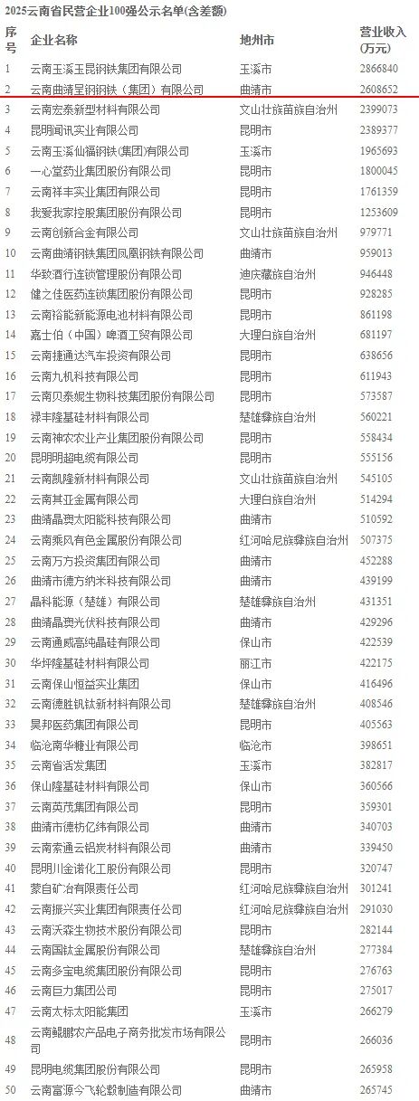 据报告显示,2025云南省民营100强的入围门槛为11.43亿元,其中“制造业20强”入围门槛为42.25亿元,服务业20强入围门槛为17.90亿元。曲靖有17家民营企业上榜“2025云南省民营企业100强”,实现营业收入760.18亿元。其中,5家企业上榜“制造业20强”,2家企业上榜“服务业20强”,2家企业上榜“吸纳就业100强”。