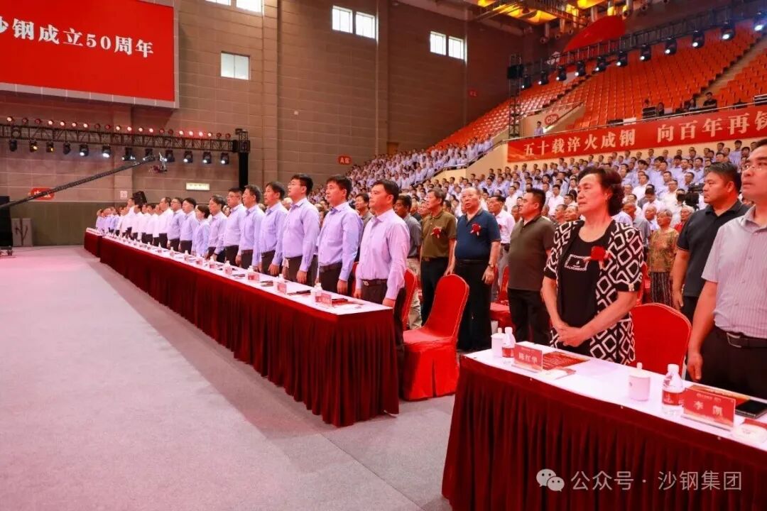 张家港市领导韩卫、顾晓东、邵军民、王亚方、赵建明、李炳龙、蒋鹏、万资平、赵瑜,以及市各有关部门和单位主要负责人,冶金园(锦丰镇)领导班子成员、相关局室主要负责人出席大会。沙钢集团领导沈彬、龚盛、陈少慧、何春生、季永新、陈晓东、施一新、马毅,以及本部全体公司领导,老同志代表、干部职工代表、相关嘉宾欢聚一堂,共庆沙钢五十华诞,展望打造“百年沙钢”的宏图新篇。集团各成员企业视频参会。