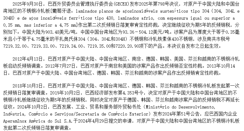 - 巴西对华不锈钢冷轧板作出第二次反倾销日落复审终裁2025/10/10