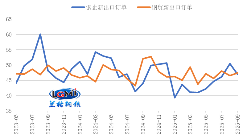 从钢材出口订单来看,我国钢铁企业出口订单指数回落至收缩区间;中物联钢铁物流专业委员会调查的2025年9月份钢铁企业新出口订单指数为46.9%,较上月回落3.5个百分点(详见图5);中金协&兰格钢铁网调研的钢铁流通企业新出口订单指数为47.5%,较上月回升0.9个百分点。钢铁行业出口订单指数均在收缩区间运行,将对我国后期钢材出口有所抑制。