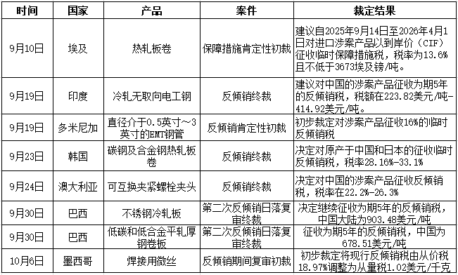 表1 9月份以来其他国家对中国钢材贸易调查裁定结果