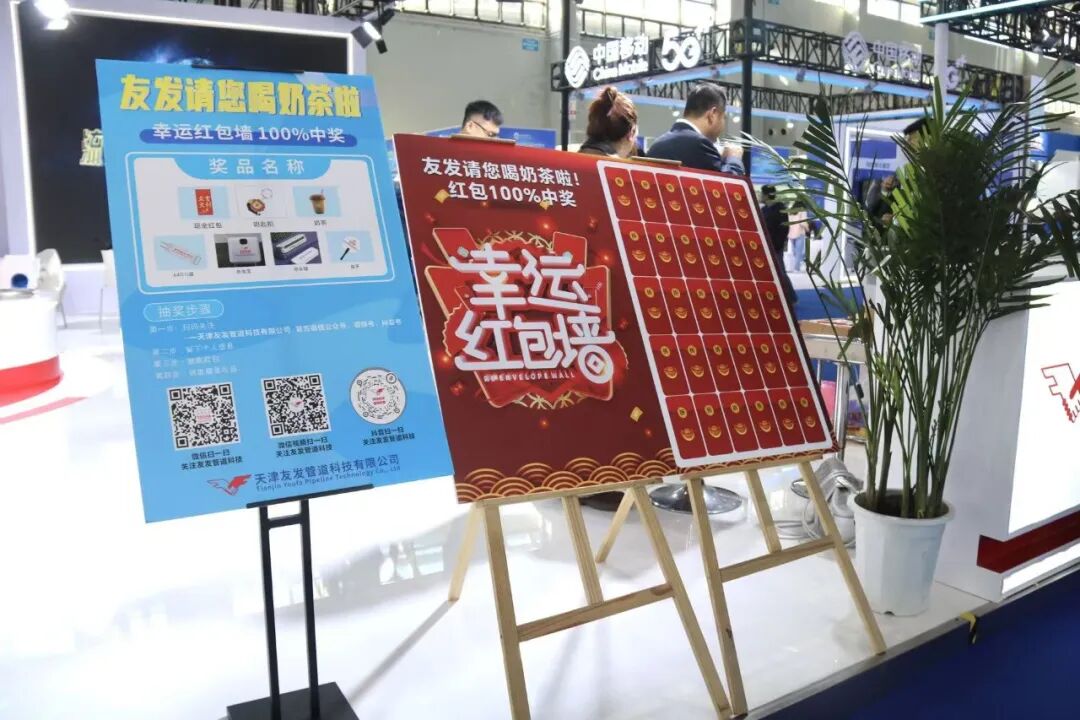 友发管道科技延续了“产品展示+趣味互动”的参展特色,在展位设置了定制化红包墙幸运大抽奖活动。喜庆的红包墙内搭载了友发定制64GB优盘、停车牌、钥匙扣、充电宝、扇子、奶茶、现金红包等礼品,吸引了千余名参观者驻足参与——现场排队人群蜿蜒至展区通道,参观者通过扫码打卡即可参与互动,既活跃了展会氛围,也让专业观众在技术交流之余,感受到友发管道年轻化、创新化的品牌形象。据统计,展会期间友发展位累计接待参观咨询超870人次,派发产品宣传册及礼品超700份,有效提升了品牌在东北水利行业的知名度与亲和力。