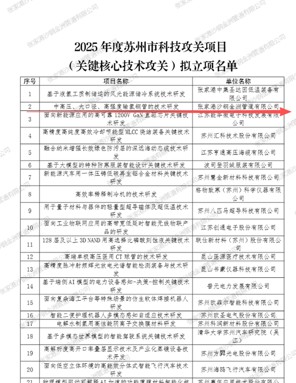 9月,公司凭借“中高压、大口径、高强度输氢钢管的技术研发”项目,成功入选2025年度苏州市科技攻关项目(关键核心技术攻关与重大科技成果转化),进一步夯实了在氢气长输管道领域的技术领先地位。