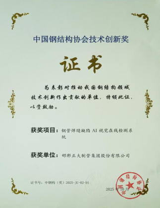 正大制管集团再获殊荣:“钢管焊缝缺陷AI视觉在线检测系统”斩获中国钢结构协会技术创新奖