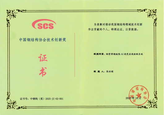 2025年10月13日至15日,中国钢结构协会第九届会员代表大会暨2025中国钢结构大会在广西南宁隆重召开。作为钢结构行业年度盛会,本次大会吸引了全国700余位行业专家、企业代表及科研机构参会,共同见证行业技术创新的最新成果。在备受瞩目的颁奖环节中,邯郸正大制管集团股份有限公司(以下简称“正大制管”)凭借其自主研发的“钢管焊缝缺陷AI视觉在线检测系统”,荣获中国钢结构协会技术创新奖,成为行业技术升级的标杆案例。
